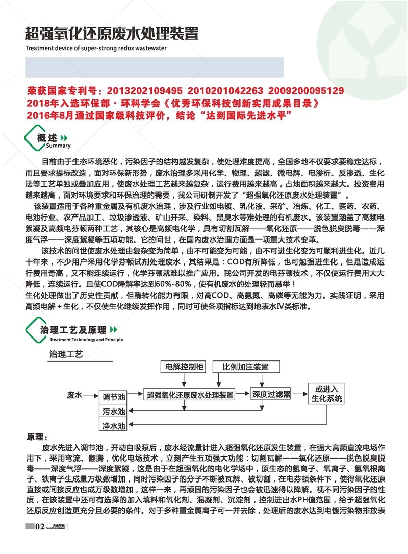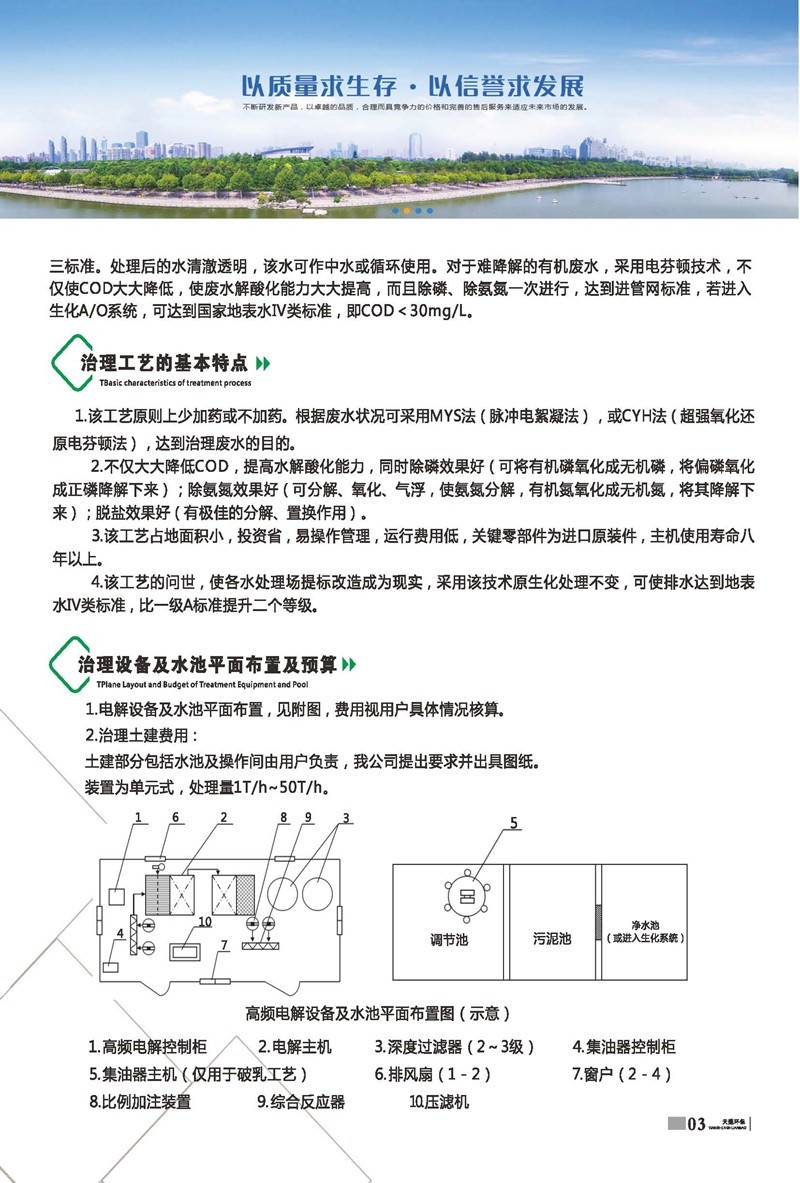 公司始建于1986年,以處理各種有機(jī)廢水、各種重金屬廢水為主,獨(dú)立研制開發(fā)多種節(jié)能環(huán)保產(chǎn)品,已獲多項(xiàng)國家發(fā)明及新型專利一種電化學(xué)廢水處理裝置 ZL 2013 2 0210949.5。公司堅(jiān)持“以質(zhì)量求生存、以信譽(yù)求發(fā)展、以市場為導(dǎo)向、以技術(shù)為依托”的宗旨。